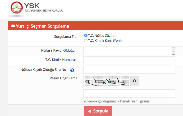 Nüfusa kayıtlı olduğunuz ili ve TC numaranızı yazın. Resim doğrulama bölümündeki şifreyi ekrana girdikten sonra sorgula tuşuna basın. Nüfustaki seçmen bilgileriniz önünüze gelecek.